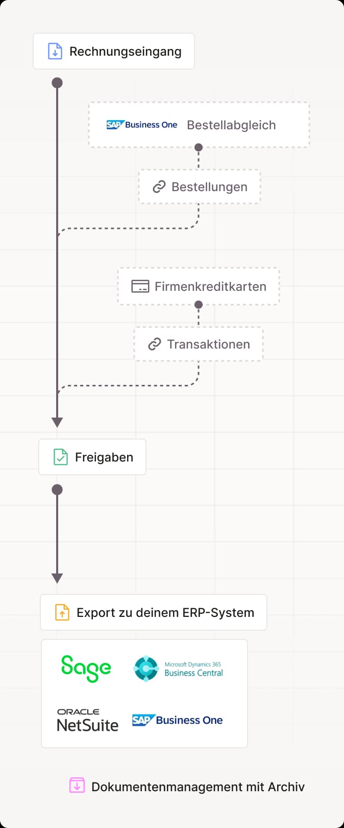 Während dein ERP die Buchung abbildet, sorgt Candis dafür, dass alle Finanzdokumente sicher archiviert, schnell auffindbar und sinnvoll verknüpft sind. Ganz ohne neue ERP-Lizenzen.