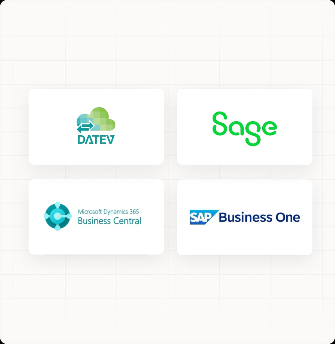 Als lizenzierter DATEV Schnittstellenpartner verbinden wir dich direkt mit DATEV Rechnungswesen und DATEV Unternehmen online, aber auch mit SAP Business One und Sage 100. Ein Klick genügt.