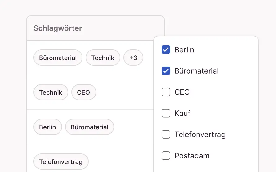 Die Erstellung individueller Vertragstypen, die Zuordnung von Verantwortlichen für Verträge, das Definieren eines eigenen Schlagwortsystems – Verträge verwalten kann so einfach sein. Mit dem integrierten Vertragsmanagement von Candis.